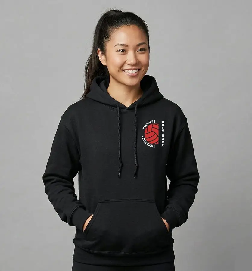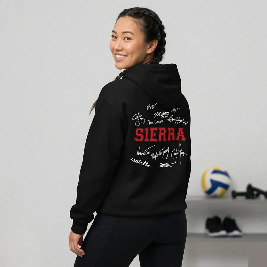 Then there’s the girls’ volleyball team. We watched that group go from zero wins in 4th grade all the way to Champions in 8th. When it came time to commemorate that journey, we designed a hoodie and had every player sign it. Four years of hard work, sweat, and pride — permanent.